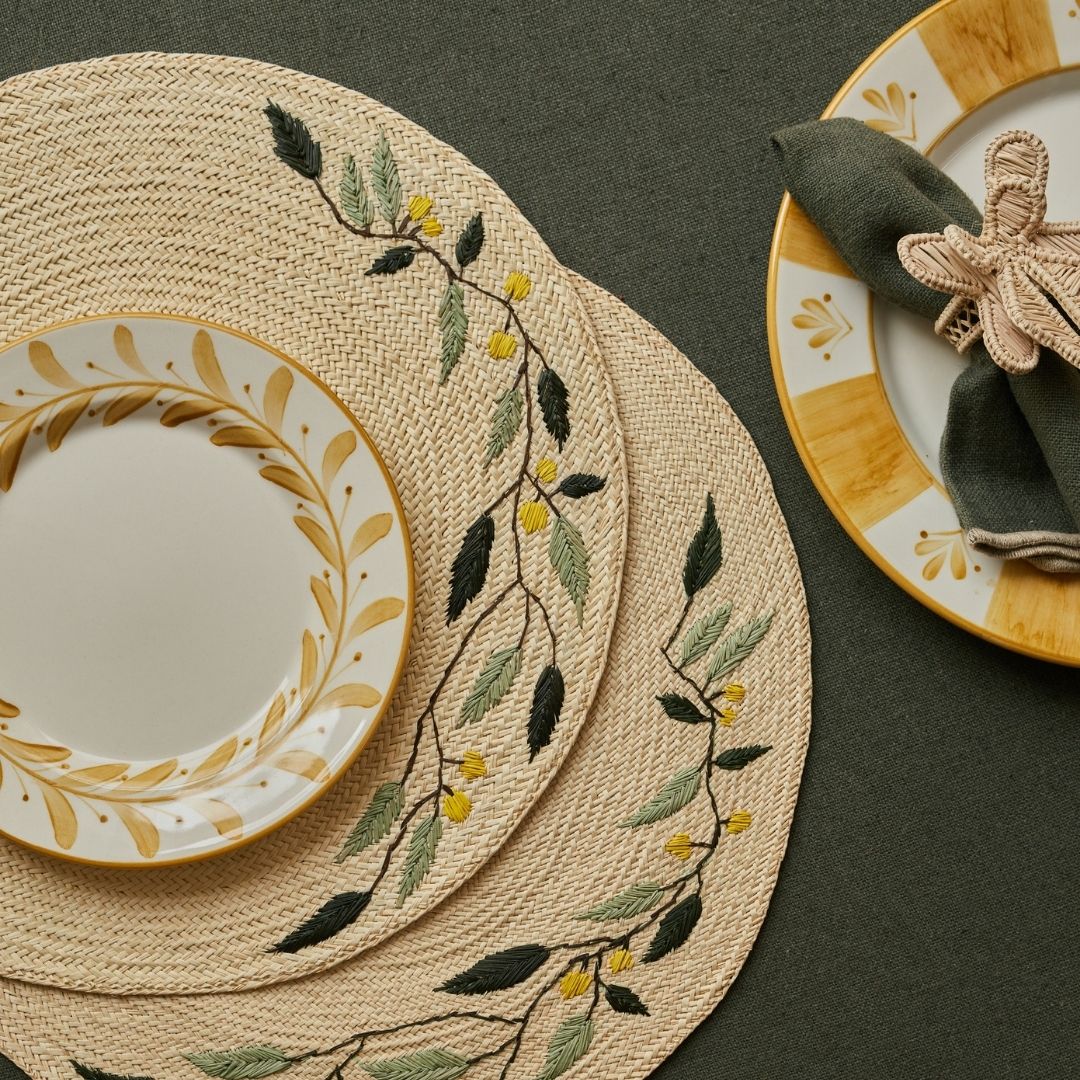 Our Golden Leaf Festive Brunch tablescape brings a refined, nature-inspired elegance to the festive season. The hand-embroidered Leaf Placemats set a beautifully textured base, their delicate stitching echoing winter foliage with soft greens and touches of golden yellow. Layered with our Carmen hand-painted plates in warm golden tones, each setting feels radiant and inviting. Finished with linen napkins gathered by our sculptural Ribbon Napkin Rings, this tablescape strikes the perfect balance between sophistication and festive charm. Ideal for a Christmas brunch that feels polished, cosy, and effortlessly celebratory.