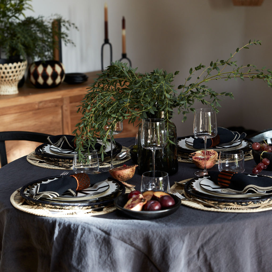 Scandi Festivities blends Nordic minimalism with CasaLatina soul — a contemporary celebration of contrast, craft, and warmth. Black and ivory hand-painted ceramics take centre stage, their bold geometry framed by woven placemats in natural fibres. The look is grounded with dark linen, elevated by werregue accents and earthy terracotta tones. A statement basket of greenery adds organic movement, while subtle amber and glass details bring quiet glow. It’s a modern festive table — stylish, grounded, and full of story.