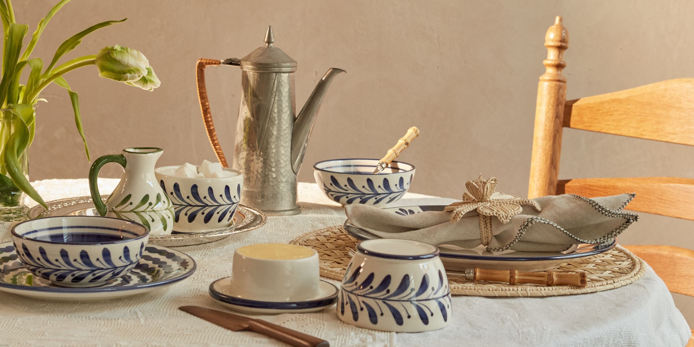 Hand-painted plates, each brushstroke applied by skilled artisans in Carmen del Viborral. The collection introduces two new colours — Deep Blue and Vintage Rose — inspired by the quiet familiarity of our grandmothers’ homes.