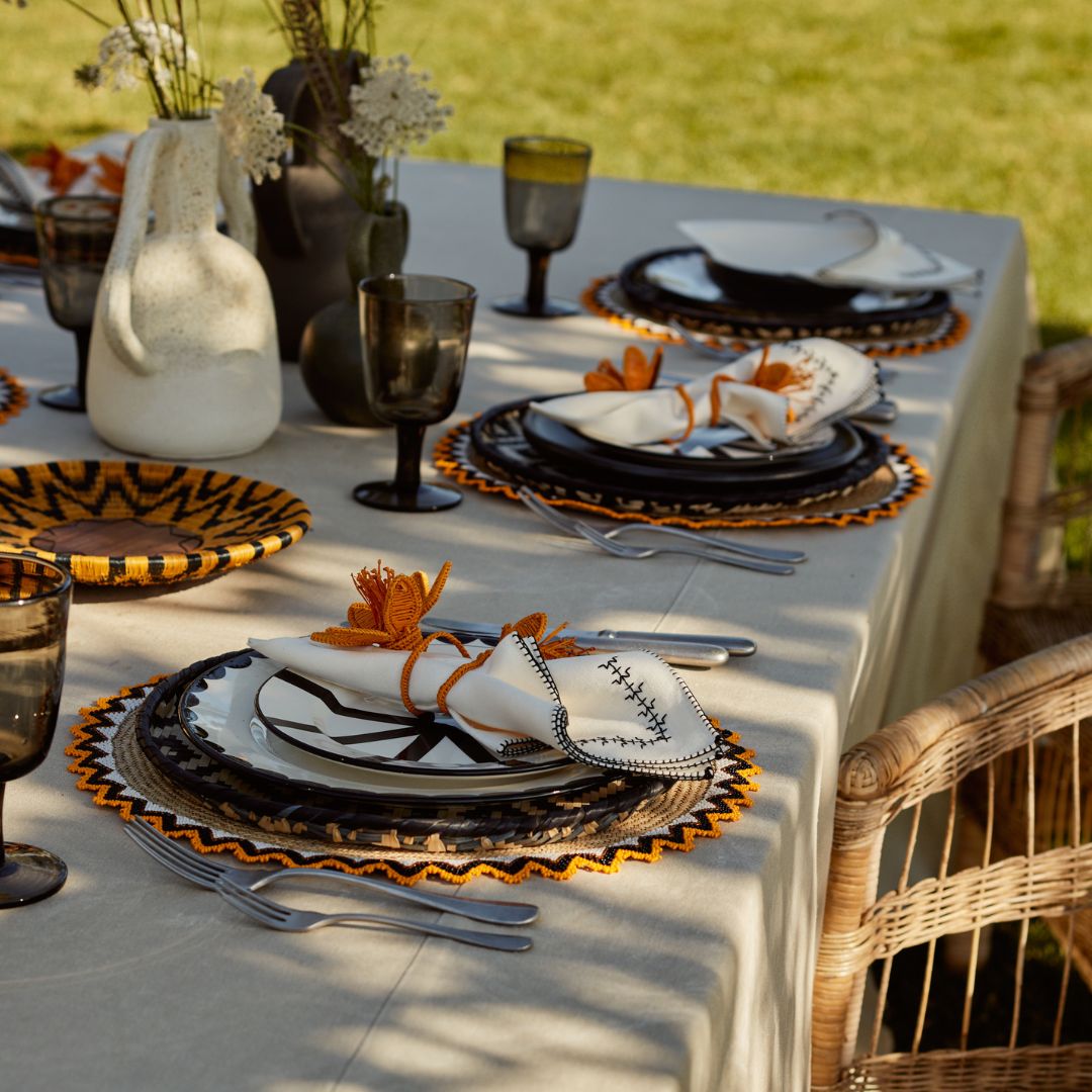 Summer Love captures the golden ease of outdoor dining — where light, warmth, and texture meet. Black and ivory ceramics anchor the setting with timeless contrast, while hand-beaded placemats in sunlit orange tones bring rhythm and energy. The look is finished with our iconic beaded flower napkin rings, each one a small masterpiece of artisanal craft. Styled for long lunches and glowing afternoons, this tablescape embodies CasaLatina’s summer spirit: radiant, joyful, and deeply connected to the handmade.