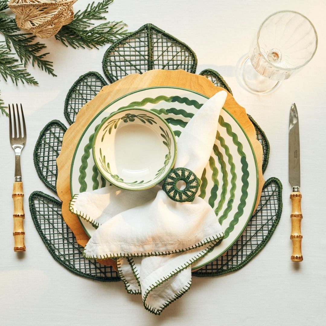 Our Alpine Breakfast Tablescape brings the crisp serenity of a winter chalet to the morning ritual. The handwoven Hoja Placemats create an organic, sculptural base, their deep green tones echoing alpine foliage. Layered above, the Selva Bevelled Charger adds a warm touch of natural wood, grounding the setting with rustic elegance. The look continues with our Magdalena hand-painted crockery in the Cascos and Ondas designs, paired with fresh white linens and the Sol Napkin Ring in matching green. Clean, refined, and quietly luxurious, it’s the perfect setting for a cosy, chalet-inspired festive breakfast.